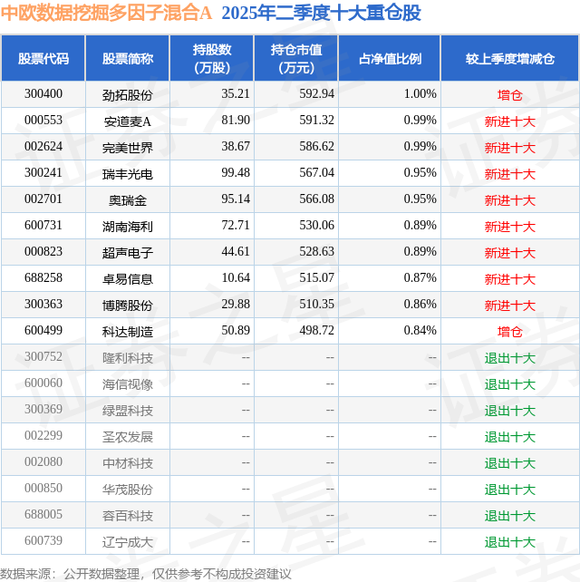 中欧数据挖掘多因子混合A的前十大重仓股如下: