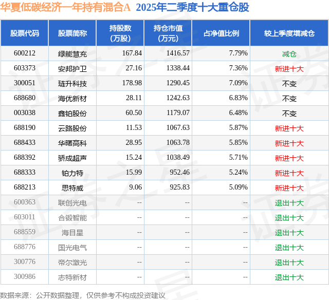 根据2025基金半年报公募基金重仓股数据,重仓该股的公募基金共4家,其中持有数量最多的公募基金为华夏基金的华夏低碳经济一年持有混合A。华夏低碳经济一年持有混合A目前规模为1.32亿元,最新净值0.7923(8月8日),较上一交易日上涨0.46%,近一年上涨39.15%。该公募基金现任基金经理为吕佳玮。吕佳玮在任的基金产品包括:华夏节能环保股票A,管理时间为2017年8月11日至今,期间收益率为87.67%;华夏核心成长混合A,管理时间为2021年12月3日至今,期间收益率为-28.16%;华夏成长机会一年持有混合,管理时间为2023年4月6日至今,期间收益率为-10.63%。