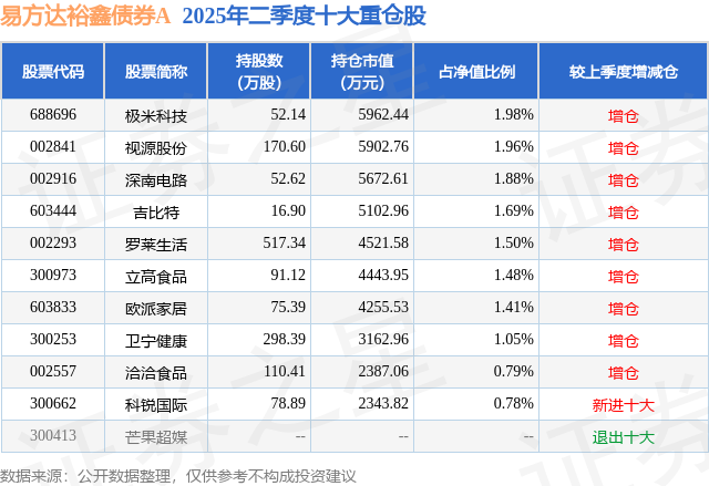 根据2025基金半年报公募基金重仓股数据,重仓该股的公募基金共25家,其中持有数量最多的公募基金为易方达基金的易方达裕鑫债券A。易方达裕鑫债券A目前规模为20.34亿元,最新净值1.6463(8月8日),较上一交易日下跌0.15%,近一年上涨25.56%。该公募基金现任基金经理为胡文伯。胡文伯在任的基金产品包括:易方达鑫转招利混合A,管理时间为2023年3月16日至今,期间收益率为12.95%;易方达磐固六个月持有期混合A,管理时间为2023年6月21日至今,期间收益率为6.04%。