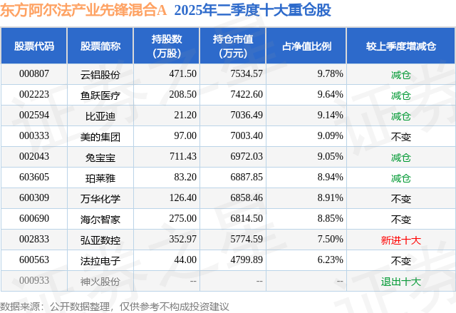 根据2025基金半年报公募基金重仓股数据,重仓该股的公募基金共2家,其中持有数量最多的公募基金为东方阿尔法基金的东方阿尔法产业先锋混合A。东方阿尔法产业先锋混合A目前规模为5.89亿元,最新净值0.5193(8月11日),较上一交易日上涨2.22%,近一年上涨30.02%。该公募基金现任基金经理为尹智斌 周谧。周谧在任的基金产品包括:东方阿尔法优选混合A,管理时间为2023年3月3日至今,期间收益率为3.33%;东方阿尔法科技优选混合发起A,管理时间为2025年6月12日至今,期间收益率为3.09%;尹智斌在任的基金产品包括:东方阿尔法兴科一年持有混合A,管理时间为2023年11月1日至今,期间收益率为18.12%;