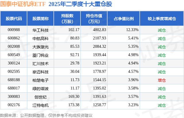 国泰中证机床ETF的前十大重仓股如下: