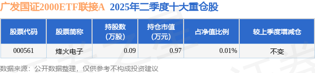 根据2025基金半年报公募基金重仓股数据,重仓该股的公募基金共1家,其中持有数量最多的公募基金为广发基金的广发国证2000ETF联接A。广发国证2000ETF联接A目前规模为0.94亿元,最新净值1.5001(8月11日),较上一交易日上涨1.3%,近一年上涨57.99%。该公募基金现任基金经理为霍华明。霍华明在任的基金产品包括:广发信息技术联接A,管理时间为2017年4月20日至今,期间收益率为25.38%;广发医药卫生联接A,管理时间为2017年4月20日至今,期间收益率为8.23%;广发中证全指医药卫生ETF,管理时间为2017年4月20日至今,期间收益率为8.59%;广发中证全指信息技术ETF,管理时间为2017年4月20日至今,期间收益率为27.95%。