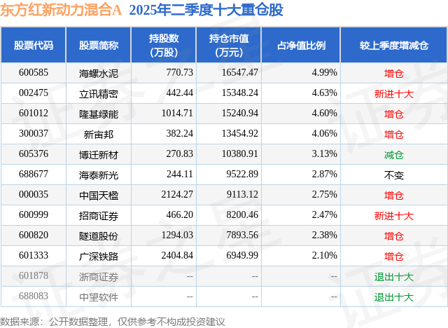 根据2025基金半年报公募基金重仓股数据,重仓该股的公募基金共9家,其中持有数量最多的公募基金为东方红资产管理的东方红新动力混合A。东方红新动力混合A目前规模为27.76亿元,最新净值5.279(8月11日),较上一交易日上涨1.71%,近一年上涨38.74%。该公募基金现任基金经理为周云。周云在任的基金产品包括:东方红京东大数据混合A,管理时间为2015年9月14日至今,期间收益率为230.02%;东方红睿轩三年持有混合,管理时间为2022年5月21日至今,期间收益率为33.05%;东方红优享红利混合A,管理时间为2022年7月16日至今,期间收益率为29.88%。