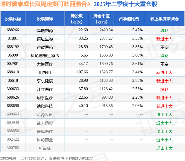 博时健康成长双周定期可赎回混合A的前十大重仓股如下: