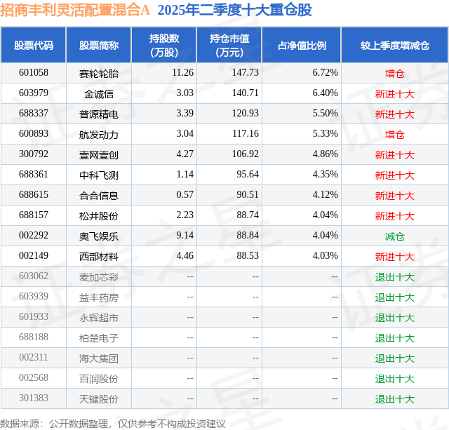 招商丰利灵活配置混合A的前十大重仓股如下: