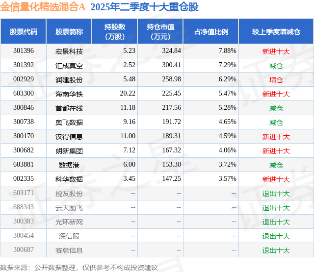 金信量化精选混合A的前十大重仓股如下: