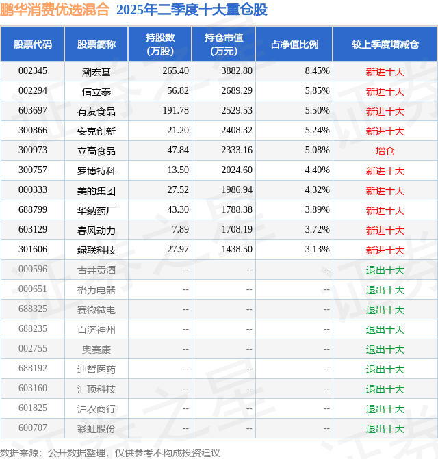 根据2025基金半年报公募基金重仓股数据,重仓该股的公募基金共6家,其中持有数量最多的公募基金为鹏华基金的鹏华消费优选混合。鹏华消费优选混合目前规模为4.6亿元,最新净值3.307(8月12日),较上一交易日上涨0.67%,近一年上涨29.58%。该公募基金现任基金经理为黄奕松。黄奕松在任的基金产品包括:鹏华核心优势混合A,管理时间为2021年12月18日至今,期间收益率为5.65%;