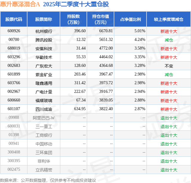 根据2025基金半年报公募基金重仓股数据,重仓该股的公募基金共19家,其中持有数量最多的公募基金为惠升基金的惠升惠泽混合A。惠升惠泽混合A目前规模为5.3亿元,最新净值1.0965(8月12日),较上一交易日上涨0.69%,近一年上涨27.81%。该公募基金现任基金经理为孙庆 钱睿南 徐玉良。孙庆在任的基金产品包括:惠升和睿兴利债券A,管理时间为2021年3月23日至今,期间收益率为6.27%;惠升和悦债券A,管理时间为2025年3月26日至今,期间收益率为3.25%。