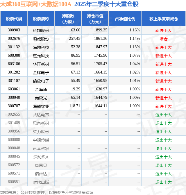 根据2025基金半年报公募基金重仓股数据,重仓该股的公募基金共4家,其中持有数量最多的公募基金为大成基金的大成360互联网+大数据100A。大成360互联网+大数据100A目前规模为6.98亿元,最新净值3.09(8月13日),较上一交易日上涨0.46%,近一年上涨85.33%。该公募基金现任基金经理为夏高。夏高在任的基金产品包括:大成沪深300增强发起式A,管理时间为2021年2月23日至今,期间收益率为-10.62%;大成动态量化配置策略混合A,管理时间为2023年4月14日至今,期间收益率为5.69%;大成中证500指数增强A,管理时间为2024年7月19日至今,期间收益率为32.43%。