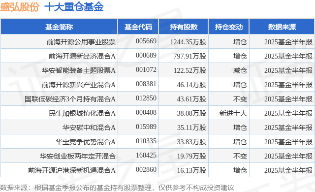 重仓盛弘股份的前十大公募基金请见下表: