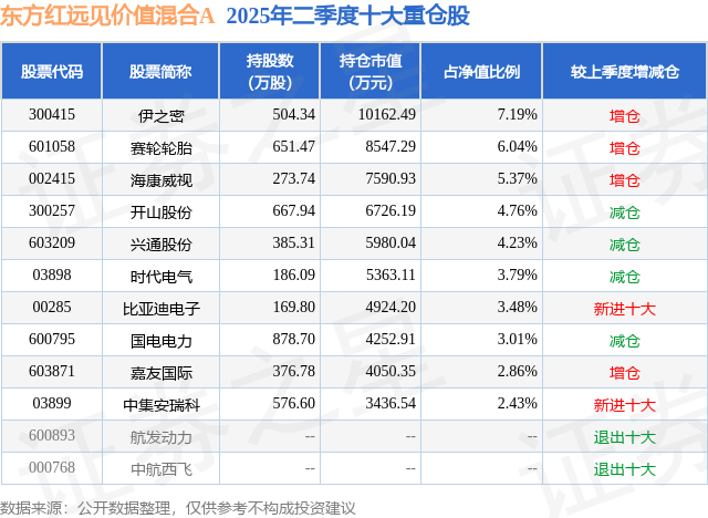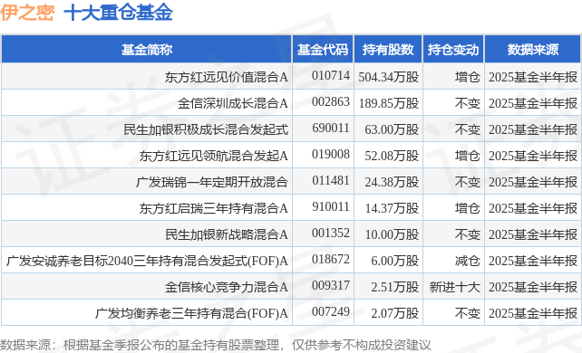 根据2025基金半年报公募基金重仓股数据,重仓该股的公募基金共11家,其中持有数量最多的公募基金为东方红资产管理的东方红远见价值混合A。东方红远见价值混合A目前规模为12.89亿元,最新净值1.1054(8月13日),较上一交易日上涨0.76%,近一年上涨38.66%。该公募基金现任基金经理为周杨。周杨在任的基金产品包括:东方红启瑞三年持有混合A,管理时间为2023年10月28日至今,期间收益率为10.79%;东方红远见领航混合发起A,管理时间为2023年11月16日至今,期间收益率为12.1%;东方红远见精选混合A,管理时间为2025年3月5日至今,期间收益率为20.41%。