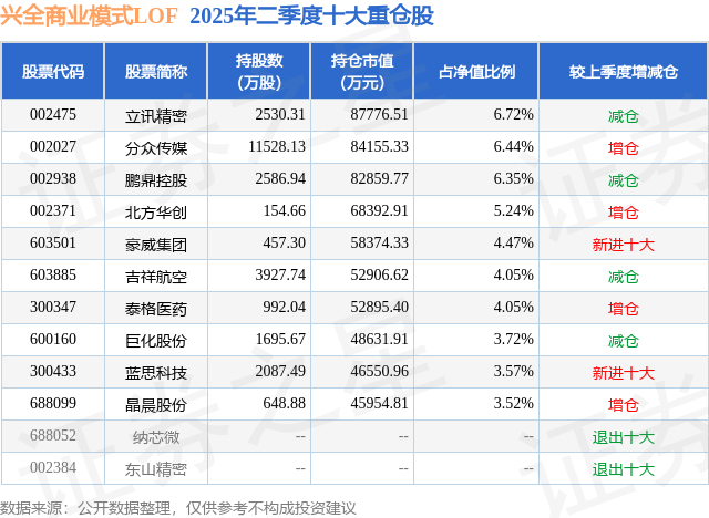 根据2025基金半年报公募基金重仓股数据,重仓该股的公募基金共36家,其中持有数量最多的公募基金为兴证全球基金的兴全商业模式LOF。兴全商业模式LOF目前规模为130.25亿元,最新净值3.925(8月13日),较上一交易日上涨1.97%,近一年上涨37.29%。该公募基金现任基金经理为乔迁。乔迁在任的基金产品包括:兴全新视野定开混合,管理时间为2021年10月20日至今,期间收益率为5.5%。