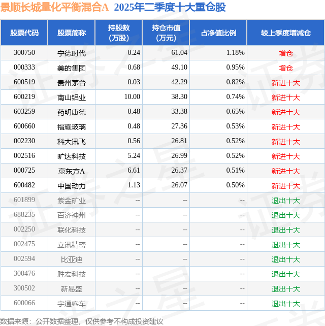 景顺长城量化平衡混合A的前十大重仓股如下: