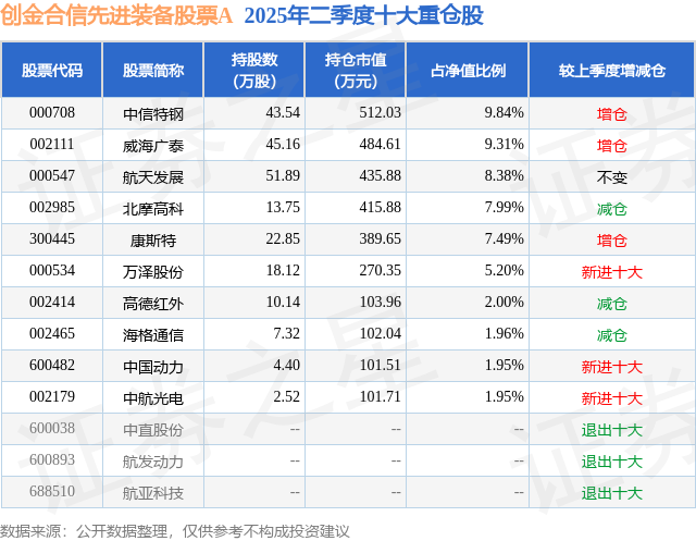 根据2025基金半年报公募基金重仓股数据,重仓该股的公募基金共1家,其中持有数量最多的公募基金为创金合信基金的创金合信先进装备股票A。创金合信先进装备股票A目前规模为0.29亿元,最新净值1.3749(8月13日),较上一交易日上涨0.12%,近一年上涨49.4%。该公募基金现任基金经理为李晗。
