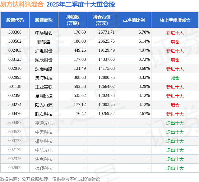 根据2025基金半年报公募基金重仓股数据,重仓该股的公募基金共14家,其中持有数量最多的公募基金为易方达基金的易方达科讯混合。易方达科讯混合目前规模为38.49亿元,最新净值2.2126(8月14日),较上一交易日下跌2.37%,近一年上涨84.78%。该公募基金现任基金经理为刘健维。刘健维在任的基金产品包括:易方达科融混合,管理时间为2020年6月6日至今,期间收益率为177.49%;易方达成长动力混合A,管理时间为2022年2月8日至今,期间收益率为62.8%;易方达成长进取混合A,管理时间为2025年6月19日至今,期间收益率为7.55%。