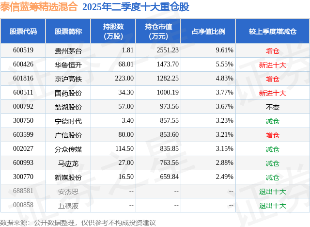 根据2025基金半年报公募基金重仓股数据,重仓该股的公募基金共5家,其中持有数量最多的公募基金为泰信基金的泰信蓝筹精选混合。泰信蓝筹精选混合目前规模为2.66亿元,最新净值1.4859(8月15日),较上一交易日上涨0.92%,近一年上涨25.54%。该公募基金现任基金经理为徐慕浩。徐慕浩在任的基金产品包括:泰信竞争优选混合,管理时间为2019年8月17日至今,期间收益率为161.72%;