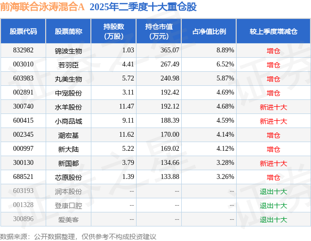 根据2025基金半年报公募基金重仓股数据,重仓该股的公募基金共2家,其中持有数量最多的公募基金为前海联合的前海联合泳涛混合A。前海联合泳涛混合A目前规模为0.12亿元,最新净值1.2613(8月19日),较上一交易日上涨0.66%,近一年上涨16.45%。该公募基金现任基金经理为王静。