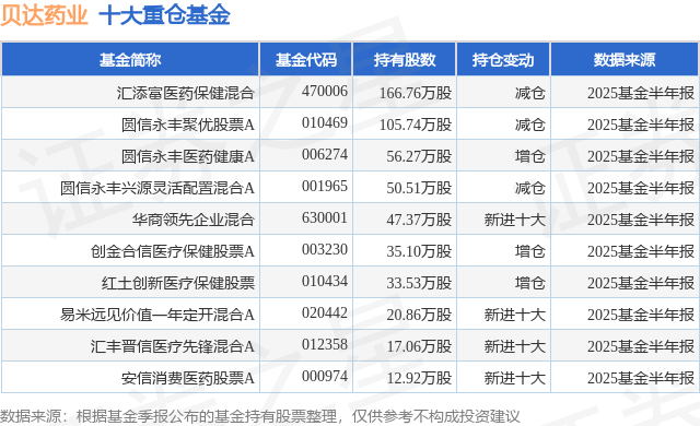 根据2025基金半年报公募基金重仓股数据,重仓该股的公募基金共31家,其中持有数量最多的公募基金为汇添富基金的汇添富医药保健混合。汇添富医药保健混合目前规模为23.58亿元,最新净值2.086(8月19日),较上一交易日下跌0.24%,近一年上涨40.09%。该公募基金现任基金经理为郑磊。郑磊在任的基金产品包括:汇添富中盘积极成长混合A,管理时间为2020年3月13日至今,期间收益率为28.35%;汇添富医疗积极成长一年持有混合A,管理时间为2020年8月21日至今,期间收益率为-15.81%;汇添富成长领先混合A,管理时间为2021年12月10日至今,期间收益率为4.38%。