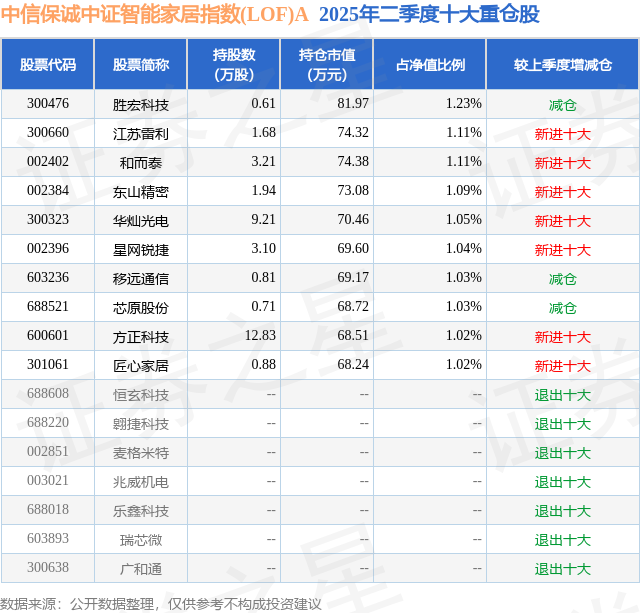 中信保诚中证智能家居指数(LOF)A的前十大重仓股如下:
