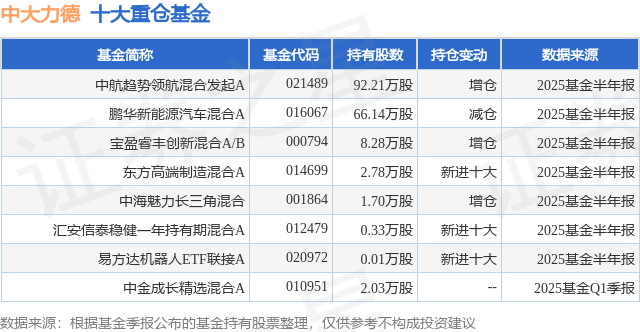 根据2025基金半年报公募基金重仓股数据,重仓该股的公募基金共7家,其中持有数量最多的公募基金为中航基金的中航趋势领航混合发起A。中航趋势领航混合发起A目前规模为1.71亿元,最新净值2.3434(8月20日),较上一交易日下跌0.67%,近一年上涨152.98%。该公募基金现任基金经理为王森。王森在任的基金产品包括:中航恒宇港股通价值优选混合发起A,管理时间为2023年9月27日至今,期间收益率为16.69%;中航远见领航混合发起A,管理时间为2024年8月30日至今,期间收益率为39.02%;中航优选领航混合发起A,管理时间为2024年12月24日至今,期间收益率为102.1%。