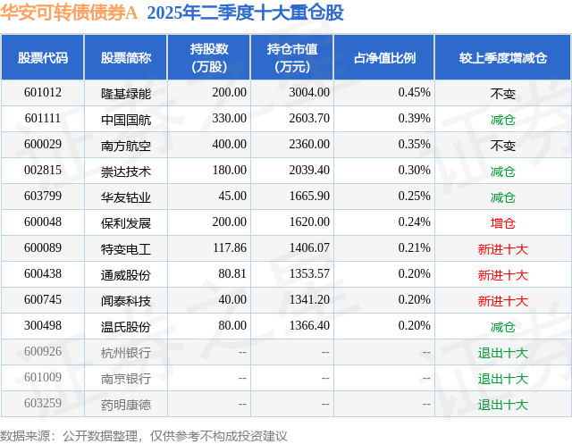 根据2025基金半年报公募基金重仓股数据,重仓该股的公募基金共1家,其中持有数量最多的公募基金为华安基金的华安可转债债券A。华安可转债债券A目前规模为35.91亿元,最新净值2.143(8月20日),较上一交易日上涨0.33%,近一年上涨31.88%。该公募基金现任基金经理为周益鸣 卢维捷。周益鸣在任的基金产品包括:华安新优选灵活配置混合A,管理时间为2019年12月10日至今,期间收益率为44.01%;华安添瑞6个月混合A,管理时间为2020年6月22日至今,期间收益率为27.87%;华安添利6个月债券A,管理时间为2021年2月5日至今,期间收益率为12.1%;