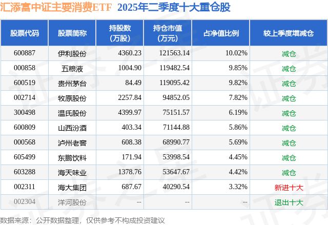 汇添富中证主要消费ETF的前十大重仓股如下: