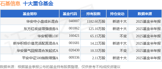 根据2025基金半年报公募基金重仓股数据,重仓该股的公募基金共6家,其中持有数量最多的公募基金为华安基金的华安中小盘成长混合。华安中小盘成长混合目前规模为18.5亿元,最新净值3.1115(8月20日),较上一交易日下跌0.6%,近一年上涨39.79%。该公募基金现任基金经理为金拓。金拓在任的基金产品包括:华安智增精选混合,管理时间为2023年10月23日至今,期间收益率为19.59%;华安景气回报混合发起式A,管理时间为2024年9月19日至今,期间收益率为22.64%;