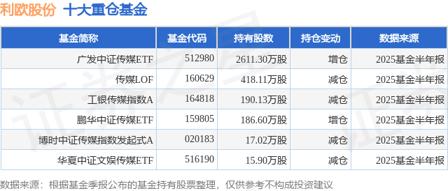 根据2025基金半年报公募基金重仓股数据,重仓该股的公募基金共6家,其中持有数量最多的公募基金为广发基金的广发中证传媒ETF。广发中证传媒ETF目前规模为25.63亿元,最新净值0.9489(8月20日),较上一交易日上涨1.01%,近一年上涨61.79%。该公募基金现任基金经理为罗国庆。罗国庆在任的基金产品包括:广发中证传媒ETF联接A,管理时间为2018年1月2日至今,期间收益率为-5.01%;广发中证A100ETF联接A,管理时间为2019年5月27日至今,期间收益率为21.02%;广发中证创新药产业ETF,管理时间为2020年12月3日至今,期间收益率为-30.57%。