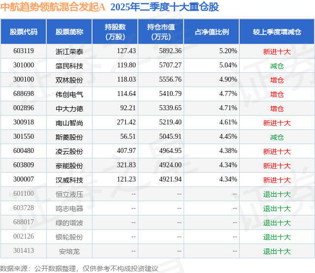 根据2025基金半年报公募基金重仓股数据,重仓该股的公募基金共5家,其中持有数量最多的公募基金为中航基金的中航趋势领航混合发起A。中航趋势领航混合发起A目前规模为1.71亿元,最新净值2.2834(8月21日),较上一交易日下跌2.56%,近一年上涨152.98%。该公募基金现任基金经理为王森。王森在任的基金产品包括:中航恒宇港股通价值优选混合发起A,管理时间为2023年9月27日至今,期间收益率为16.17%;中航远见领航混合发起A,管理时间为2024年8月30日至今,期间收益率为46.18%;中航优选领航混合发起A,管理时间为2024年12月24日至今,期间收益率为97.92%。
