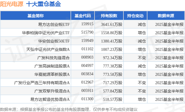 根据2025基金半年报公募基金重仓股数据,重仓该股的公募基金共315家,其中持有数量最多的公募基金为易方达基金的易方达创业板ETF。易方达创业板ETF目前规模为855.37亿元,最新净值2.5729(8月21日),较上一交易日下跌0.47%,近一年上涨68.26%。该公募基金现任基金经理为成曦 刘树荣。成曦在任的基金产品包括:易方达创业板ETF联接A,管理时间为2016年5月7日至今,期间收益率为25.5%;易方达深证100ETF,管理时间为2016年5月7日至今,期间收益率为62.18%;易方达上证科创板50成份ETF,管理时间为2020年9月28日至今,期间收益率为-17.42%。刘树荣在任的基金产品包括:易方达深证100ETF联接A,管理时间为2017年7月18日至今,期间收益率为44.34%;易方达创业板ETF联接A,管理时间为2017年7月18日至今,期间收益率为55.81%;易方达深证100ETF,管理时间为2017年7月18日至今,期间收益率为43.18%;