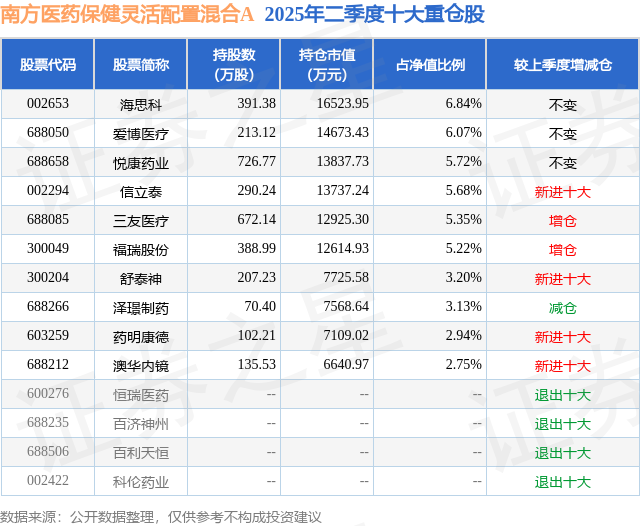 根据2025基金半年报公募基金重仓股数据,重仓该股的公募基金共11家,其中持有数量最多的公募基金为南方基金的南方医药保健灵活配置混合A。南方医药保健灵活配置混合A目前规模为24.05亿元,最新净值2.9134(8月21日),较上一交易日上涨0.06%,近一年上涨48.98%。该公募基金现任基金经理为王峥娇。
