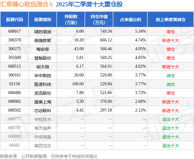 汇泉臻心致远混合A的前十大重仓股如下: