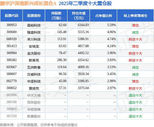 鹏华沪深港新兴成长混合A的前十大重仓股如下: