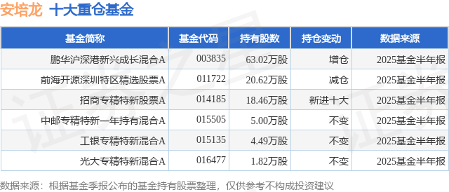 根据2025基金半年报公募基金重仓股数据,重仓该股的公募基金共6家,其中持有数量最多的公募基金为鹏华基金的鹏华沪深港新兴成长混合A。鹏华沪深港新兴成长混合A目前规模为6.91亿元,最新净值1.658(8月22日),较上一交易日上涨1.61%,近一年上涨90.09%。该公募基金现任基金经理为闫思倩。闫思倩在任的基金产品包括:鹏华新能源汽车混合A,管理时间为2022年7月26日至今,期间收益率为-1.9%;鹏华碳中和主题混合A,管理时间为2023年5月5日至今,期间收益率为76.6%;鹏华科技驱动混合发起式A,管理时间为2024年8月29日至今,期间收益率为39.83%。