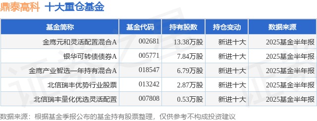 根据2025基金半年报公募基金重仓股数据,重仓该股的公募基金共5家,其中持有数量最多的公募基金为金鹰基金的金鹰元和灵活配置混合A。金鹰元和灵活配置混合A目前规模为0.51亿元,最新净值1.3133(8月22日),较上一交易日上涨1.66%,近一年上涨38.26%。该公募基金现任基金经理为倪超。倪超在任的基金产品包括:金鹰行业优势混合A,管理时间为2015年6月11日至今,期间收益率为50.91%;金鹰鑫瑞混合A,管理时间为2020年9月25日至今,期间收益率为29.31%;金鹰年年邮享一年持有债券A,管理时间为2021年11月25日至今,期间收益率为8.66%。