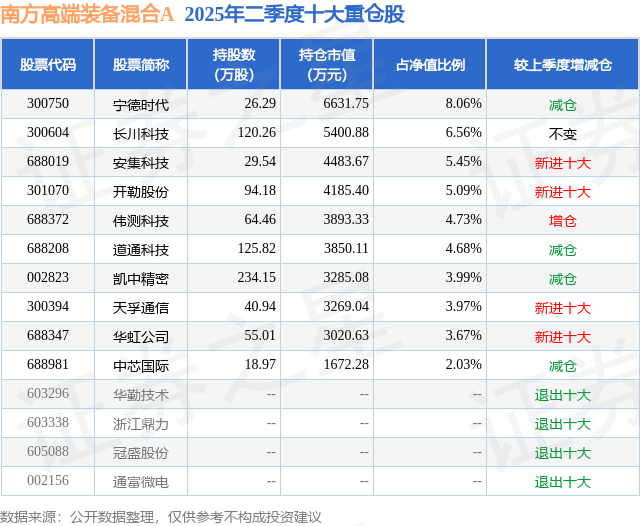 南方高端装备混合A的前十大重仓股如下: