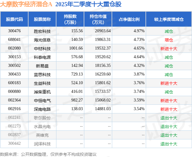 根据2025基金半年报公募基金重仓股数据,重仓该股的公募基金共7家,其中持有数量最多的公募基金为摩根士丹利基金的大摩数字经济混合A。大摩数字经济混合A目前规模为23.86亿元,最新净值2.1124(8月25日),较上一交易日上涨3.88%,近一年上涨109.81%。该公募基金现任基金经理为雷志勇。雷志勇在任的基金产品包括:大摩科技领先混合A,管理时间为2019年4月20日至今,期间收益率为118.01%;大摩万众创新混合A,管理时间为2020年5月7日至今,期间收益率为2.8%;大摩景气智选混合A,管理时间为2025年5月16日至今,期间收益率为16.75%。