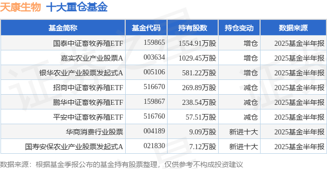 根据2025基金半年报公募基金重仓股数据,重仓该股的公募基金共8家,其中持有数量最多的公募基金为国泰基金的国泰中证畜牧养殖ETF。国泰中证畜牧养殖ETF目前规模为35.74亿元,最新净值0.6527(8月25日),较上一交易日上涨0.88%,近一年上涨27.26%。该公募基金现任基金经理为梁杏。梁杏在任的基金产品包括:国泰国证医药卫生行业指数A,管理时间为2016年6月8日至今,期间收益率为33.97%;国泰量化收益灵活配置混合A,管理时间为2018年7月31日至今,期间收益率为27.39%;国泰中证生物医药ETF联接A,管理时间为2019年4月16日至今,期间收益率为13.85%;国泰中证生物医药ETF,管理时间为2019年4月18日至今,期间收益率为12.95%。