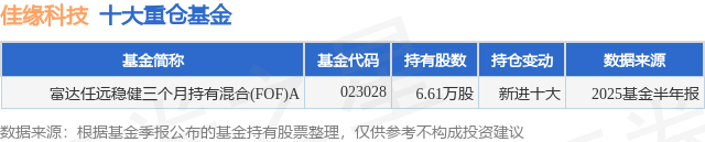 根据2025基金半年报公募基金重仓股数据,重仓该股的公募基金共1家,其中持有数量最多的公募基金为富达基金(中国)的富达任远稳健三个月持有混合(FOF)A。富达任远稳健三个月持有混合(FOF)A目前规模为1.47亿元,最新净值1.0133(8月22日),较上一交易日上涨0.28%。该公募基金现任基金经理为赵强。