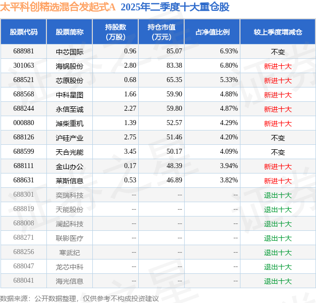 太平科创精选混合发起式A的前十大重仓股如下: