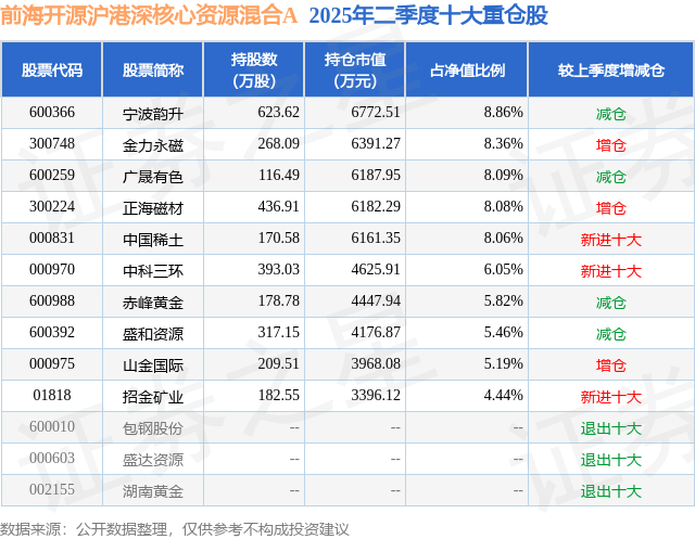 根据2025基金半年报公募基金重仓股数据,重仓该股的公募基金共9家,其中持有数量最多的公募基金为前海开源基金的前海开源沪港深核心资源混合A。前海开源沪港深核心资源混合A目前规模为2.89亿元,最新净值4.588(8月26日),较上一交易日下跌3.0%,近一年上涨89.04%。该公募基金现任基金经理为吴国清。吴国清在任的基金产品包括:前海开源一带一路混合A,管理时间为2019年7月19日至今,期间收益率为-20.27%;前海开源沪港深农业混合A,管理时间为2020年7月20日至今,期间收益率为-26.91%;前海开源金银珠宝混合A,管理时间为2021年6月1日至今,期间收益率为49.96%。