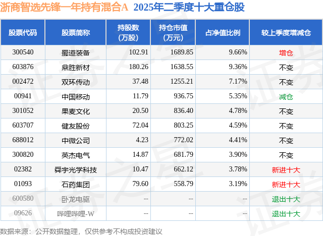 浙商智选先锋一年持有混合A的前十大重仓股如下: