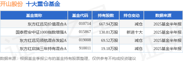根据2025基金半年报公募基金重仓股数据,重仓该股的公募基金共4家,其中持有数量最多的公募基金为东方红资产管理的东方红远见价值混合A。东方红远见价值混合A目前规模为12.89亿元,最新净值1.1606(8月26日),较上一交易日上涨0.53%,近一年上涨50.77%。该公募基金现任基金经理为周杨。周杨在任的基金产品包括:东方红启瑞三年持有混合A,管理时间为2023年10月28日至今,期间收益率为16.52%;东方红远见领航混合发起A,管理时间为2023年11月16日至今,期间收益率为18.27%;东方红远见精选混合A,管理时间为2025年3月5日至今,期间收益率为26.69%。
