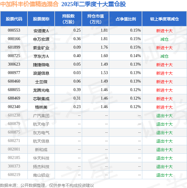 中加科丰价值精选混合的前十大重仓股如下: