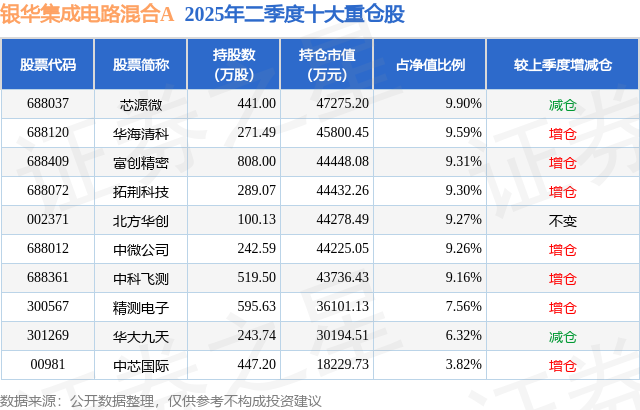 根据2025基金半年报公募基金重仓股数据,重仓该股的公募基金共24家,其中持有数量最多的公募基金为银华基金的银华集成电路混合A。银华集成电路混合A目前规模为20.77亿元,最新净值1.1986(8月27日),较上一交易日下跌1.96%,近一年上涨73.61%。该公募基金现任基金经理为方建。方建在任的基金产品包括:银华智荟内在价值灵活配置混合发起A,管理时间为2018年6月20日至今,期间收益率为174.16%;银华乐享混合A,管理时间为2021年6月22日至今,期间收益率为-21.31%;银华新锐成长混合A,管理时间为2022年3月31日至今,期间收益率为10.36%。