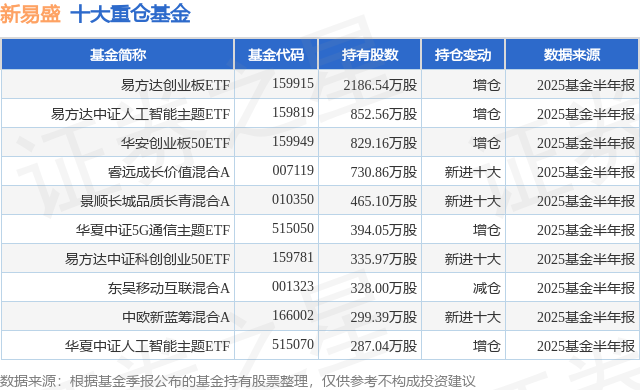 根据2025基金半年报公募基金重仓股数据,重仓该股的公募基金共609家,其中持有数量最多的公募基金为易方达基金的易方达创业板ETF。易方达创业板ETF目前规模为855.37亿元,最新净值2.6994(8月27日),较上一交易日下跌0.69%,近一年上涨79.76%。该公募基金现任基金经理为成曦 刘树荣。成曦在任的基金产品包括:易方达创业板ETF联接A,管理时间为2016年5月7日至今,期间收益率为31.63%;易方达深证100ETF,管理时间为2016年5月7日至今,期间收益率为70.6%;易方达上证科创板50成份ETF,管理时间为2020年9月28日至今,期间收益率为-8.57%。刘树荣在任的基金产品包括:易方达深证100ETF联接A,管理时间为2017年7月18日至今,期间收益率为51.44%;易方达创业板ETF联接A,管理时间为2017年7月18日至今,期间收益率为63.41%;易方达深证100ETF,管理时间为2017年7月18日至今,期间收益率为50.61%;