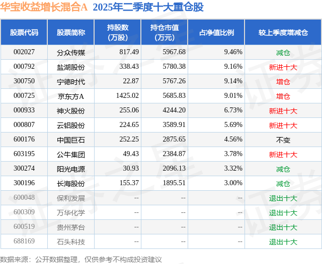 华宝收益增长混合A的前十大重仓股如下:
