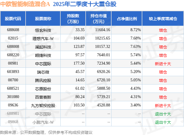 根据2025基金半年报公募基金重仓股数据,重仓该股的公募基金共20家,其中持有数量最多的公募基金为中欧基金的中欧智能制造混合A。中欧智能制造混合A目前规模为4.81亿元,最新净值1.8928(8月28日),较上一交易日上涨3.54%,近一年上涨146.36%。该公募基金现任基金经理为邵洁。邵洁在任的基金产品包括:中欧科创主题混合(LOF)C,管理时间为2022年11月22日至今,期间收益率为68.98%。