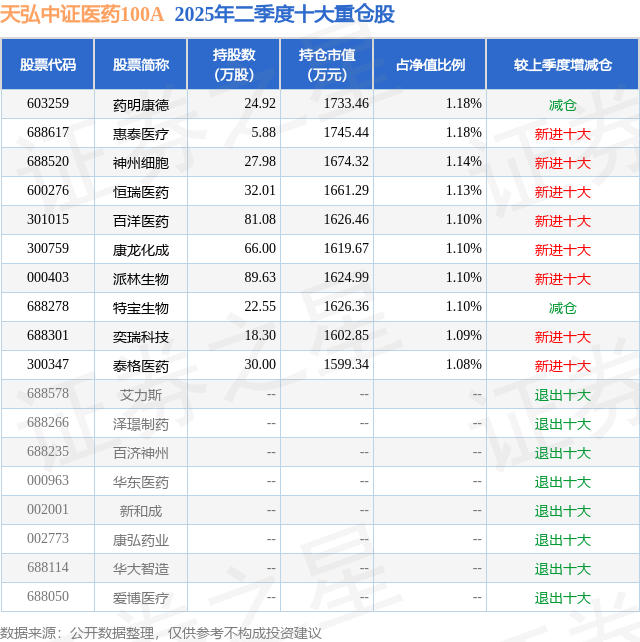 根据2025基金半年报公募基金重仓股数据,重仓该股的公募基金共2家,其中持有数量最多的公募基金为天弘基金的天弘中证医药100A。天弘中证医药100A目前规模为7.55亿元,最新净值0.866(8月28日),较上一交易日下跌0.07%,近一年上涨30.76%。该公募基金现任基金经理为贺雨轩。贺雨轩在任的基金产品包括:天弘国证生物医药ETF发起式联接A,管理时间为2021年7月1日至今,期间收益率为-57.01%;天弘恒生沪深港创新药精选50ETF,管理时间为2021年8月16日至今,期间收益率为-16.78%;天弘国证生物医药ETF,管理时间为2021年11月8日至今,期间收益率为-48.51%。