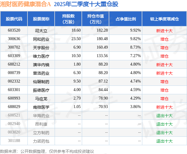 湘财医药健康混合A的前十大重仓股如下:
